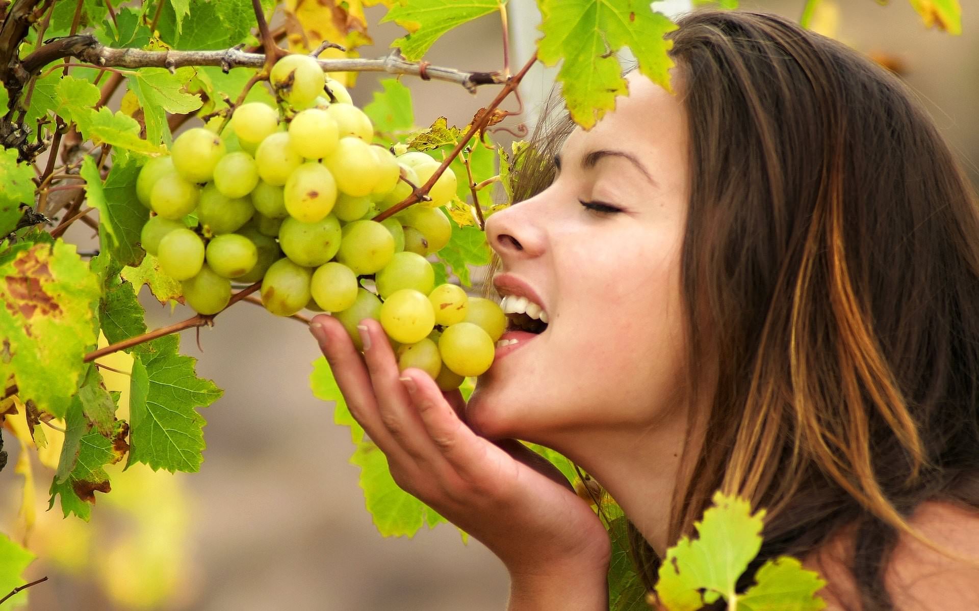 Шатенка сладко кушает виноград, красивая девушка, зеленый виноград, закрыла глаза.