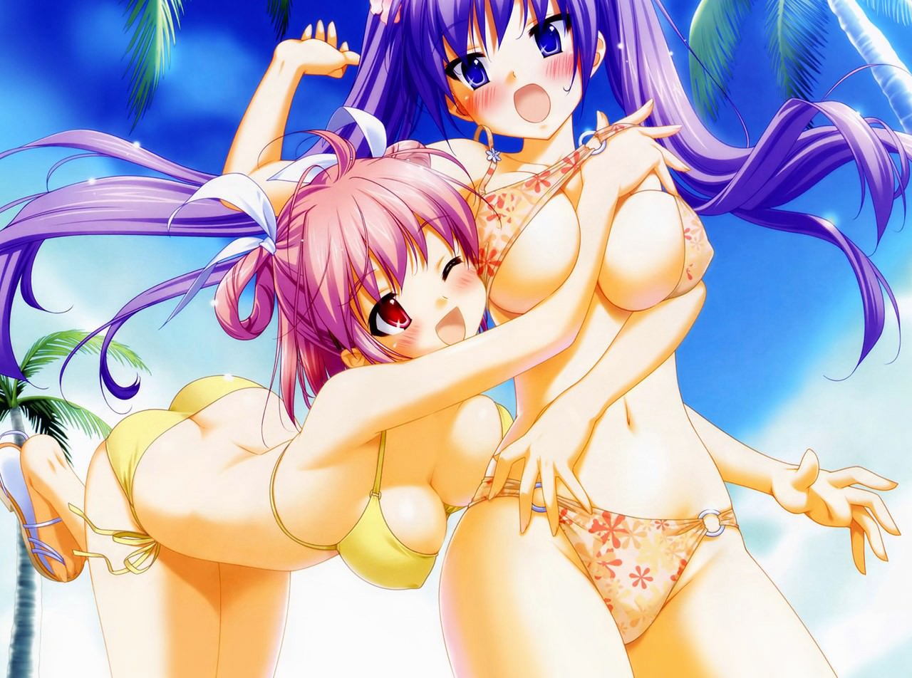Залезла в купальник подруги рукою прямо между сисек, рука сквозь сиськи! две красивые и очень сексуальные подружки в бикини на пляже заигрывают в интимные игры, сочные формы аниме девочек в бикини.
