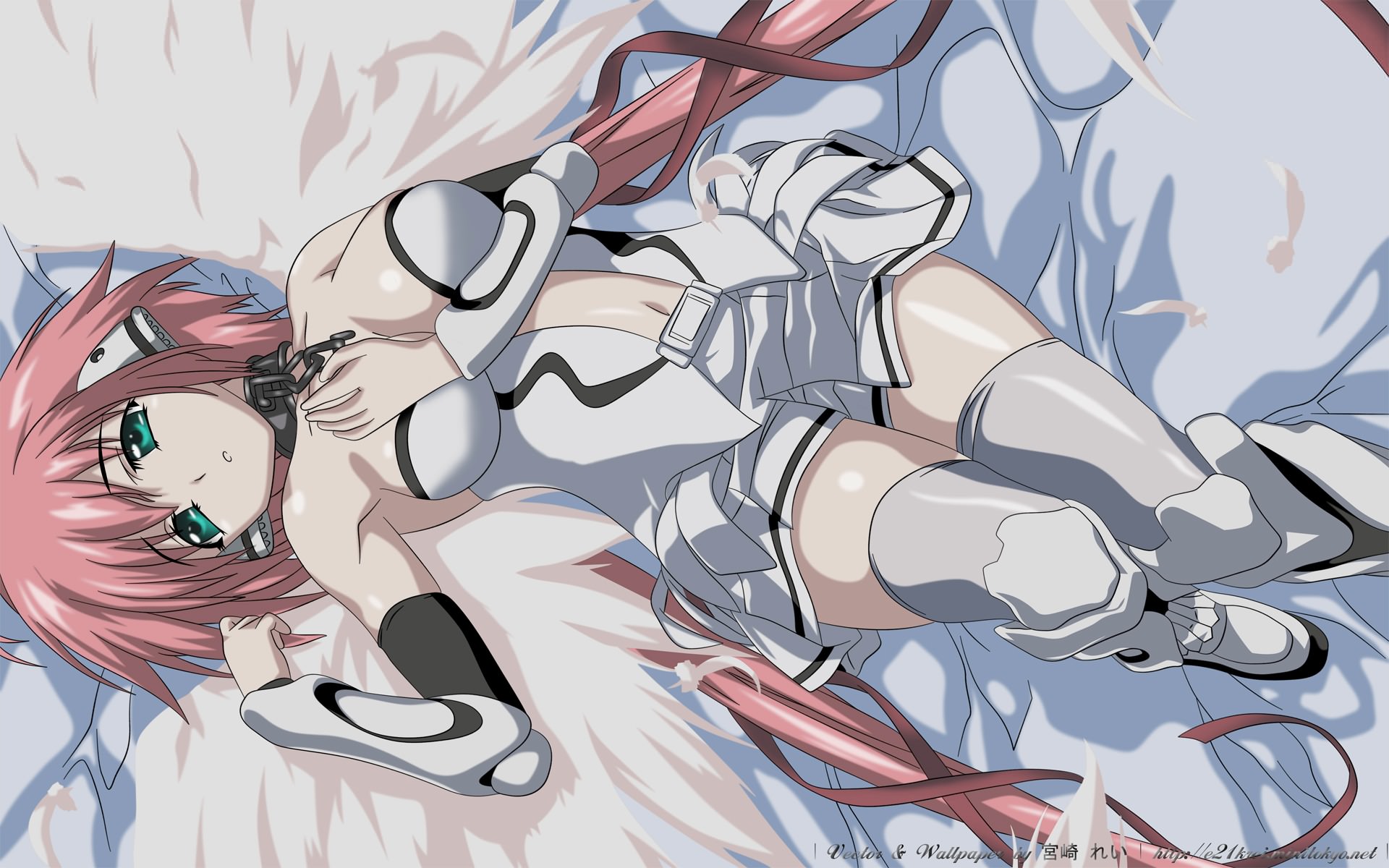 Девушка красавица ангел на кровати, длинные розовые волосы и большие белые крылья.
