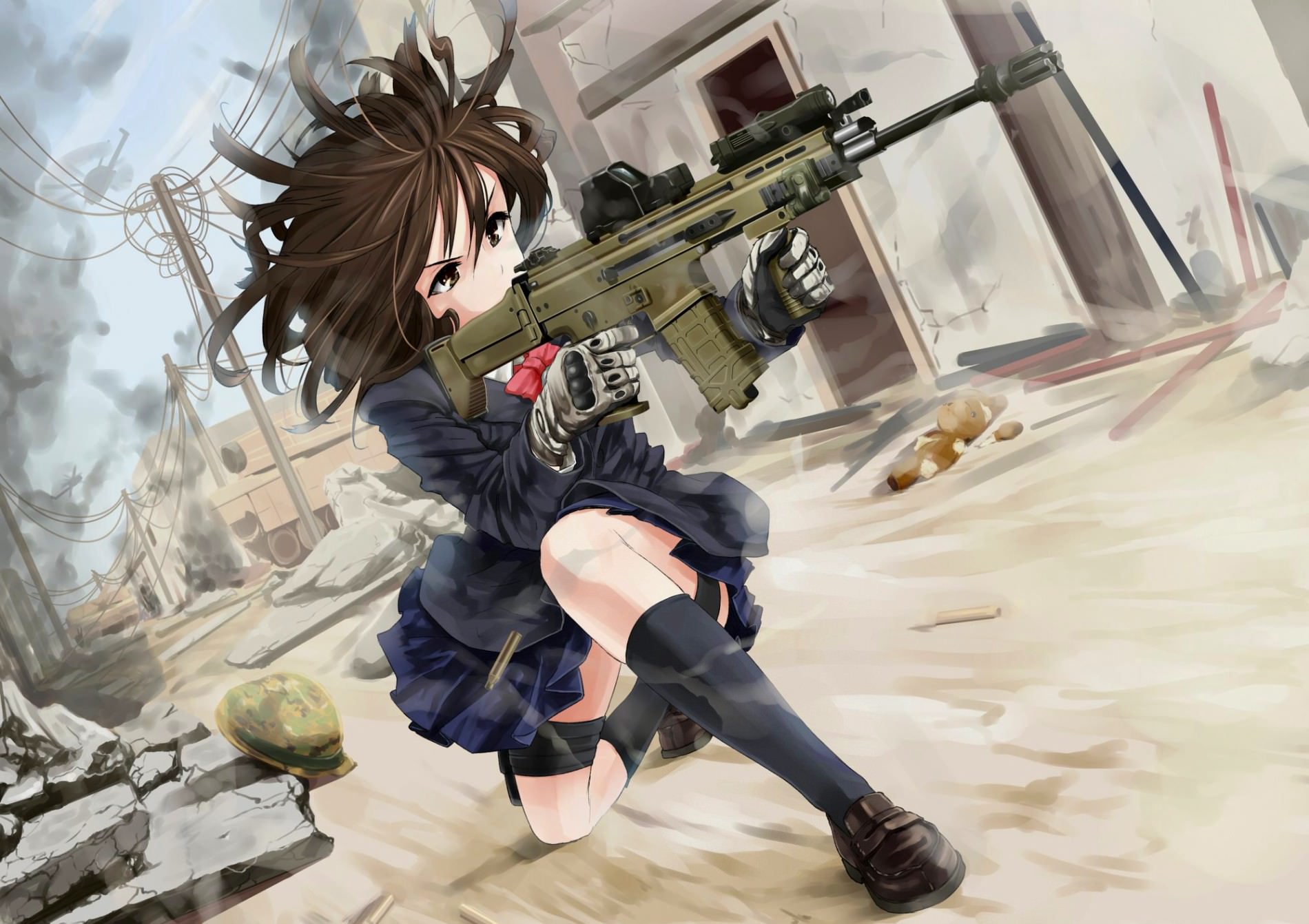 Девочка с автоматом в городе с боевыми действиями, девочка на войне, профессиональная юная убийца, горячая точка.