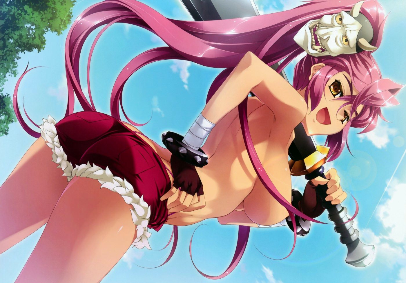 Девушка в коротких шортиках, маска на голове и огромный клинок на плече, розовые волосы и улыбчивое лицо, маска демона, короткие сексуальные шортики на попе, обнаженная грудь, большой меч в руке.