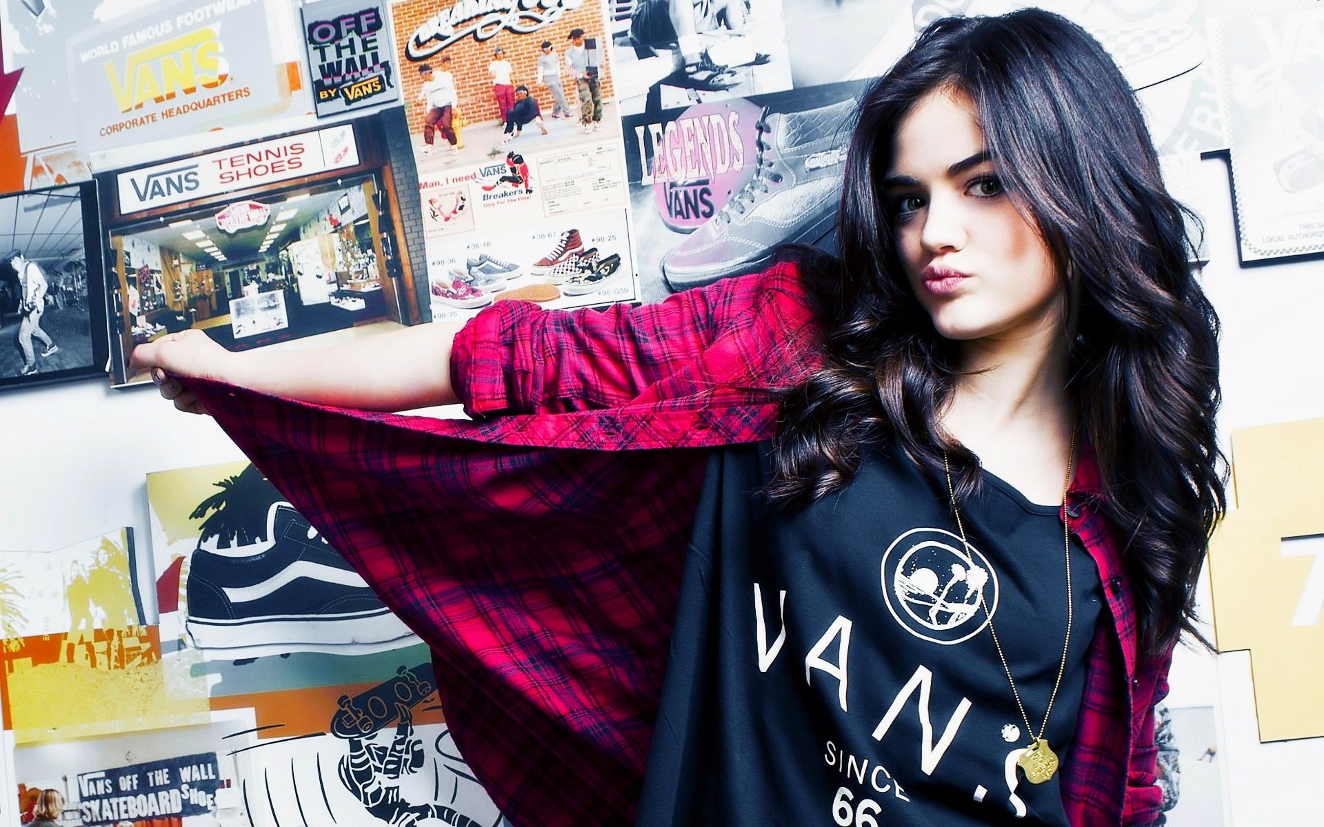 Брюнетка в черной майке и розовой клетчатой рубашке на фоне стены с плакатами, губки, черные волосы, justgirls (744).