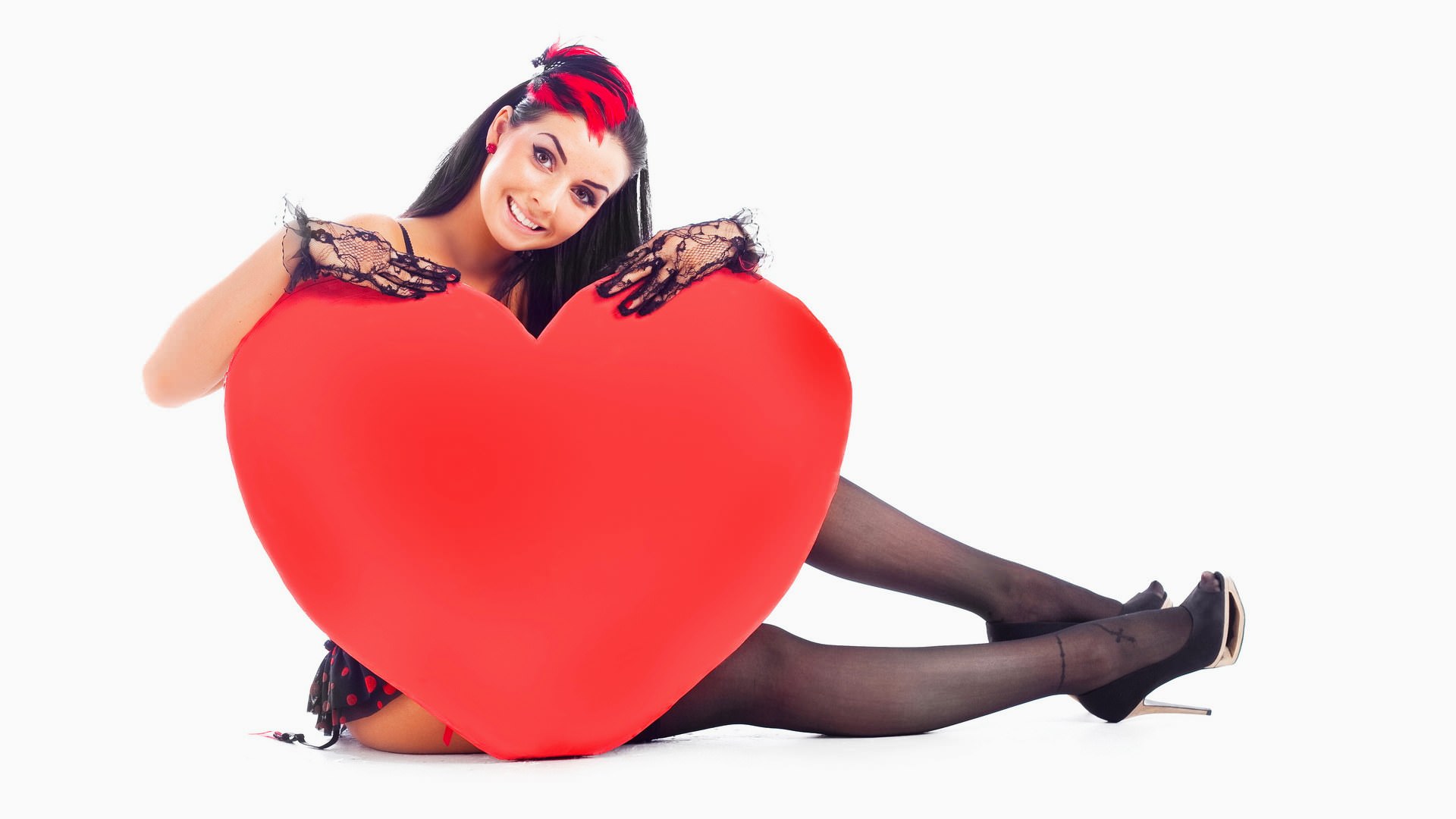 Милая девушка с красным плюшевым сердечком, перчатки, улыбка, чулки, юбка, justgirls (934).