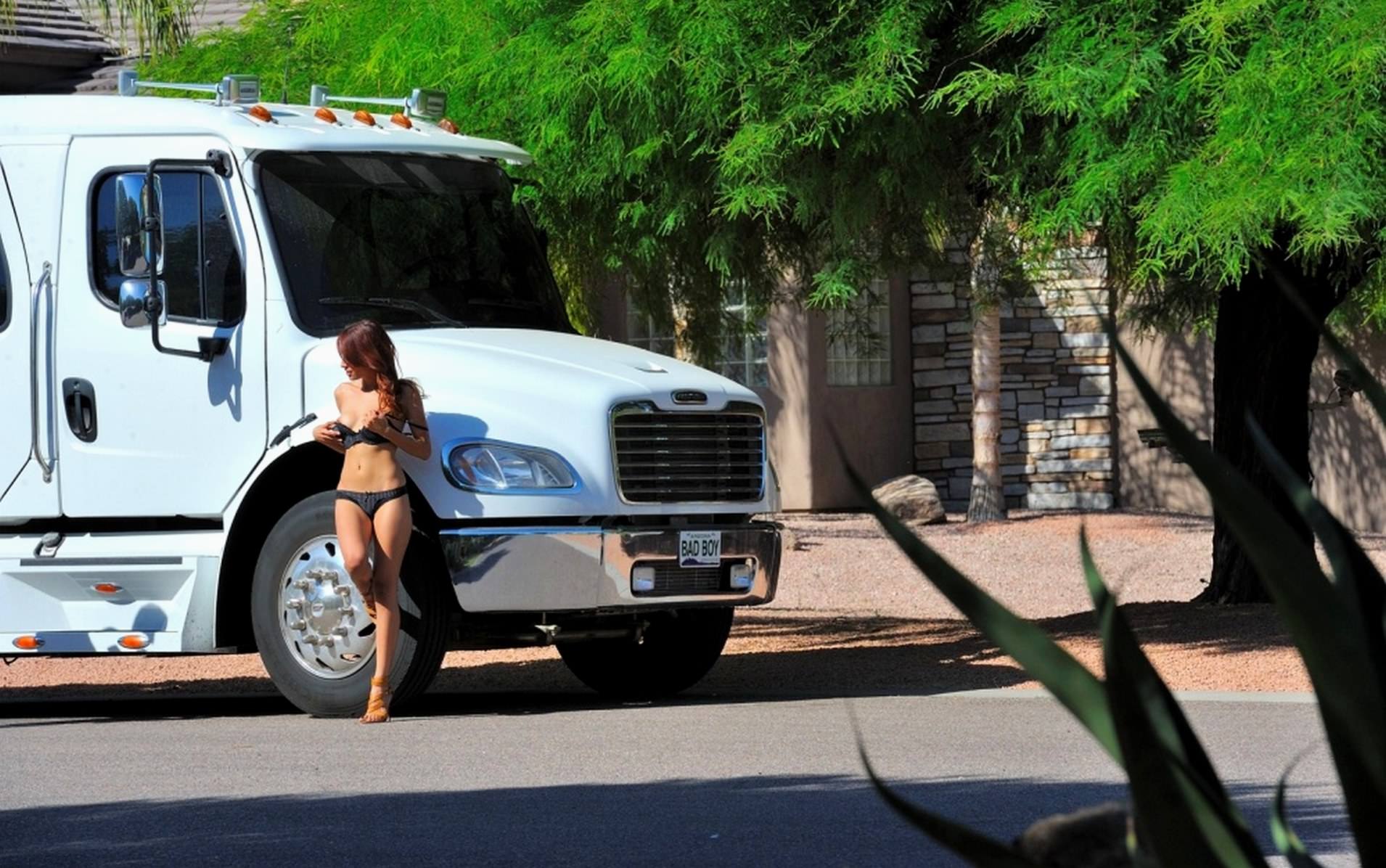 Сексуальная девушка в бикини прислонилась к огромному грузовику, показывает сиськи.