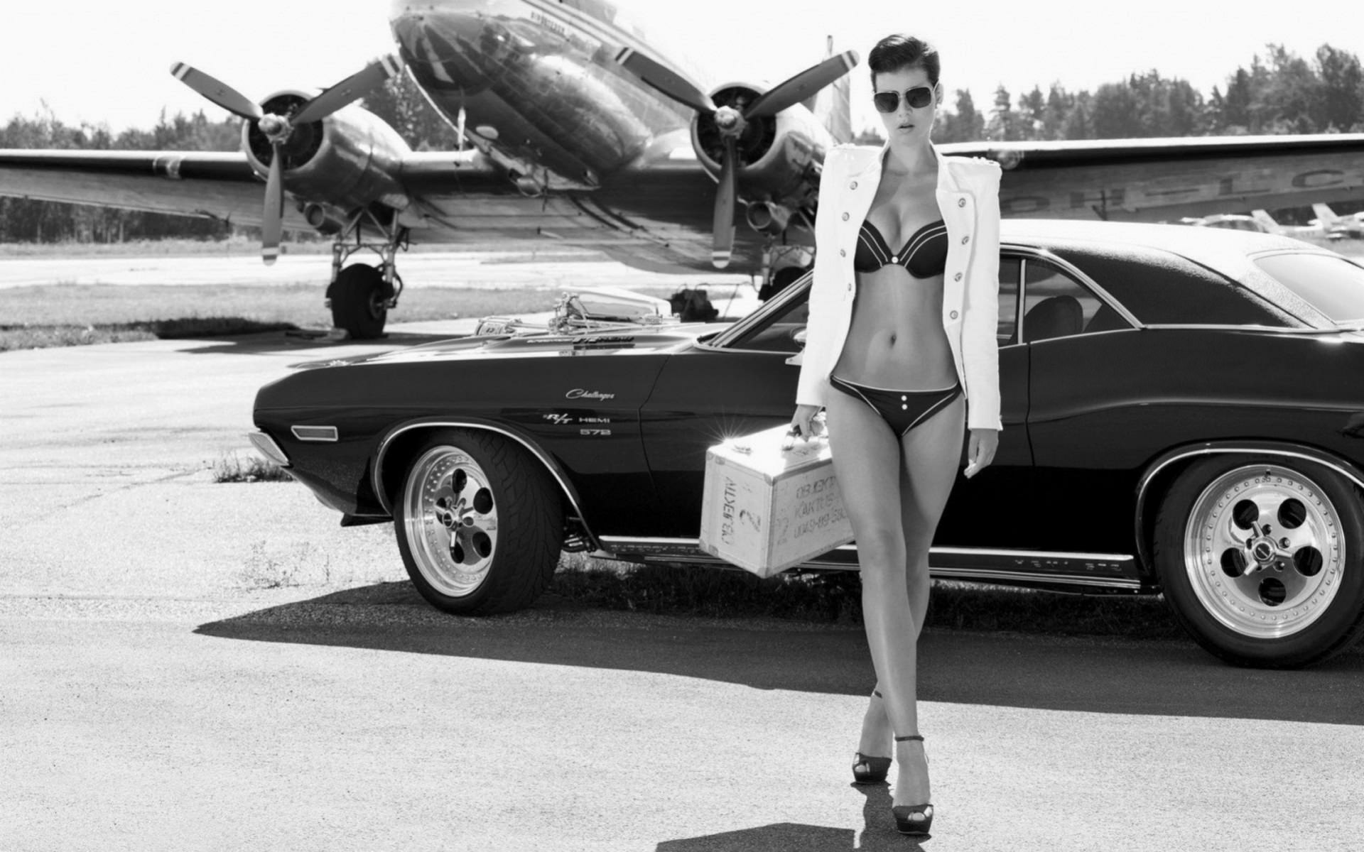 Черно-белое фото девушки в трусиках и лифчике вышедшей из авто на фоне самолета, девушка в белом пиджаке и очках с ящиком в руке, черный мускул кар.
