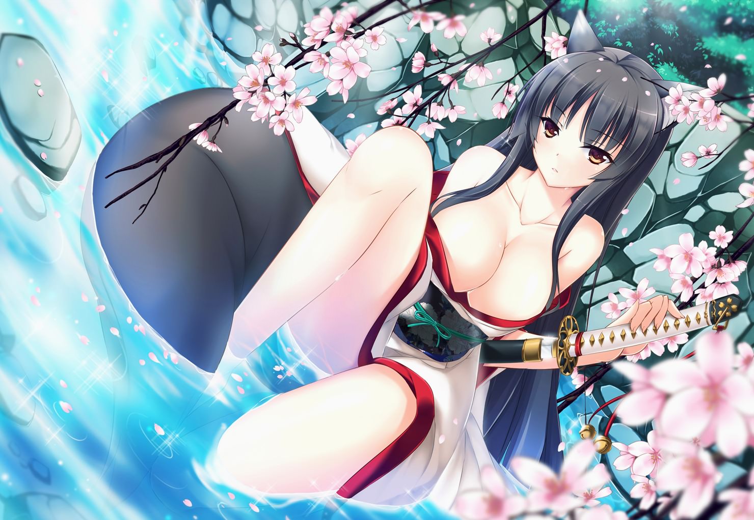 Красивая, сексуальная, девушка, с, большой, грудью, сидит, на, воде, цветы, катана, белое, кимоно, большие, сиськи, выпирают, меч, голубая, блестящая, вода