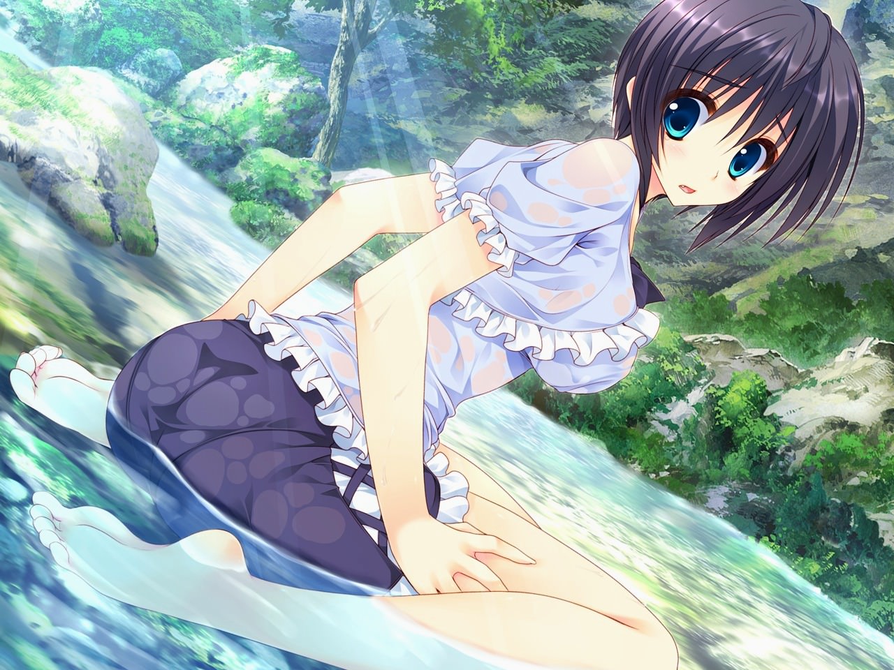 Девушка села на воду в маленькой речке, одежда промокла насквозь, белая блузка и юбка.