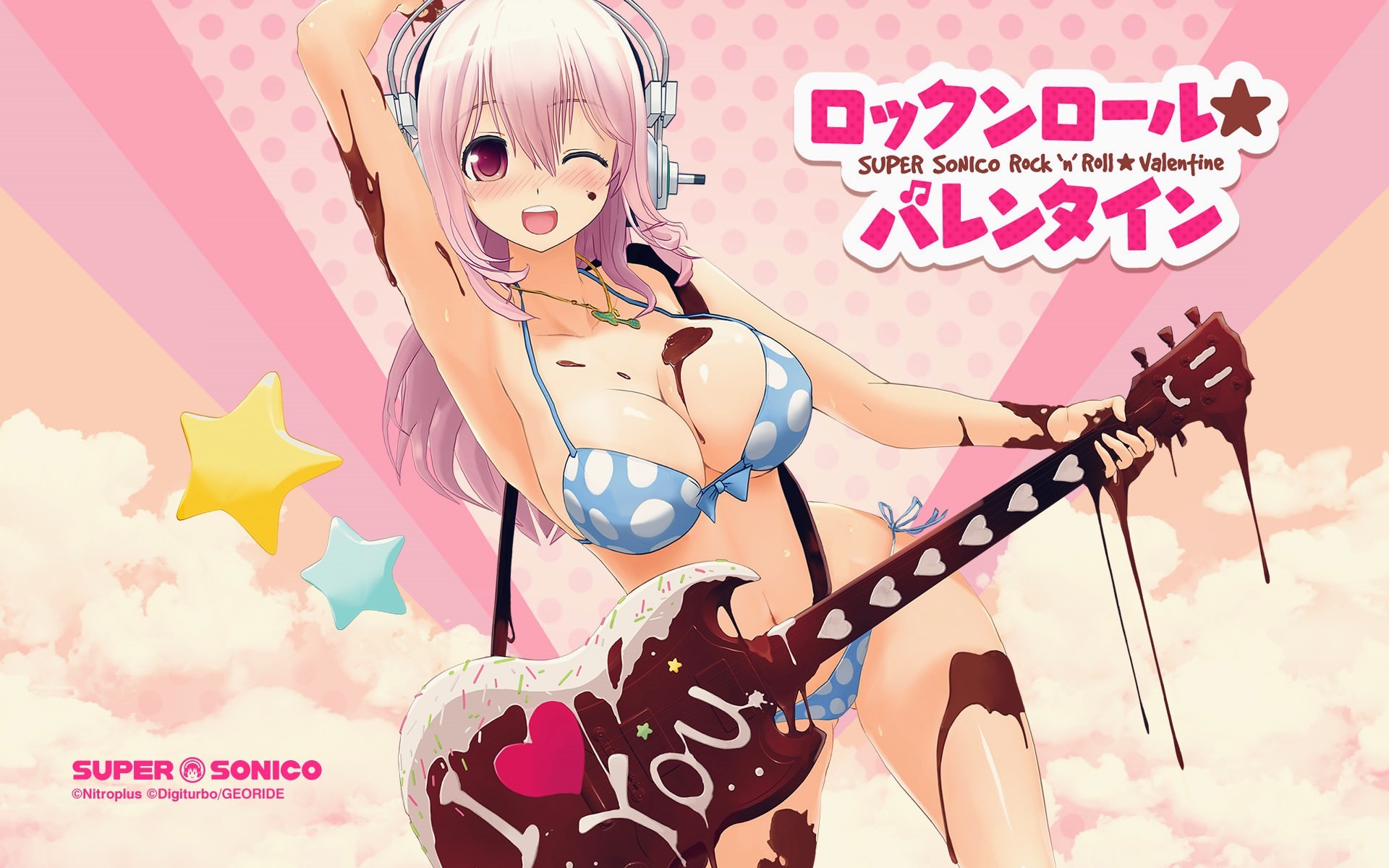 Очаровательная девушка с большой грудью в бикини, с шоколадной гитарой, I love you надпись на гитаре из шоколада, сладкая девушка, розовые волосы, девушка в голубом лифчике с классными сиськами и в наушниках, розовые облака.