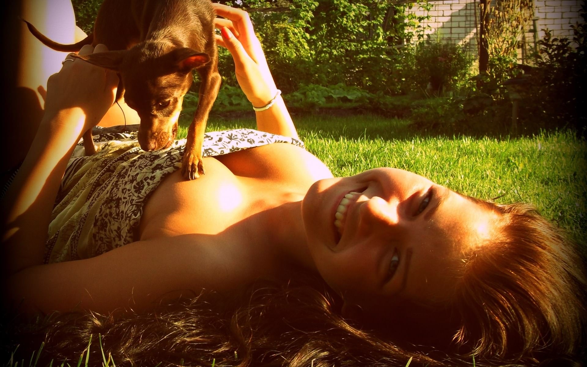 Веселая девушка с собачкой на траве.