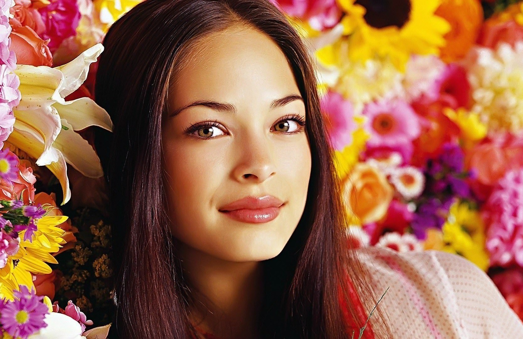 Симпатичная девушка вся в цветах, улыбка на лице, темные волосы, яркие губы.