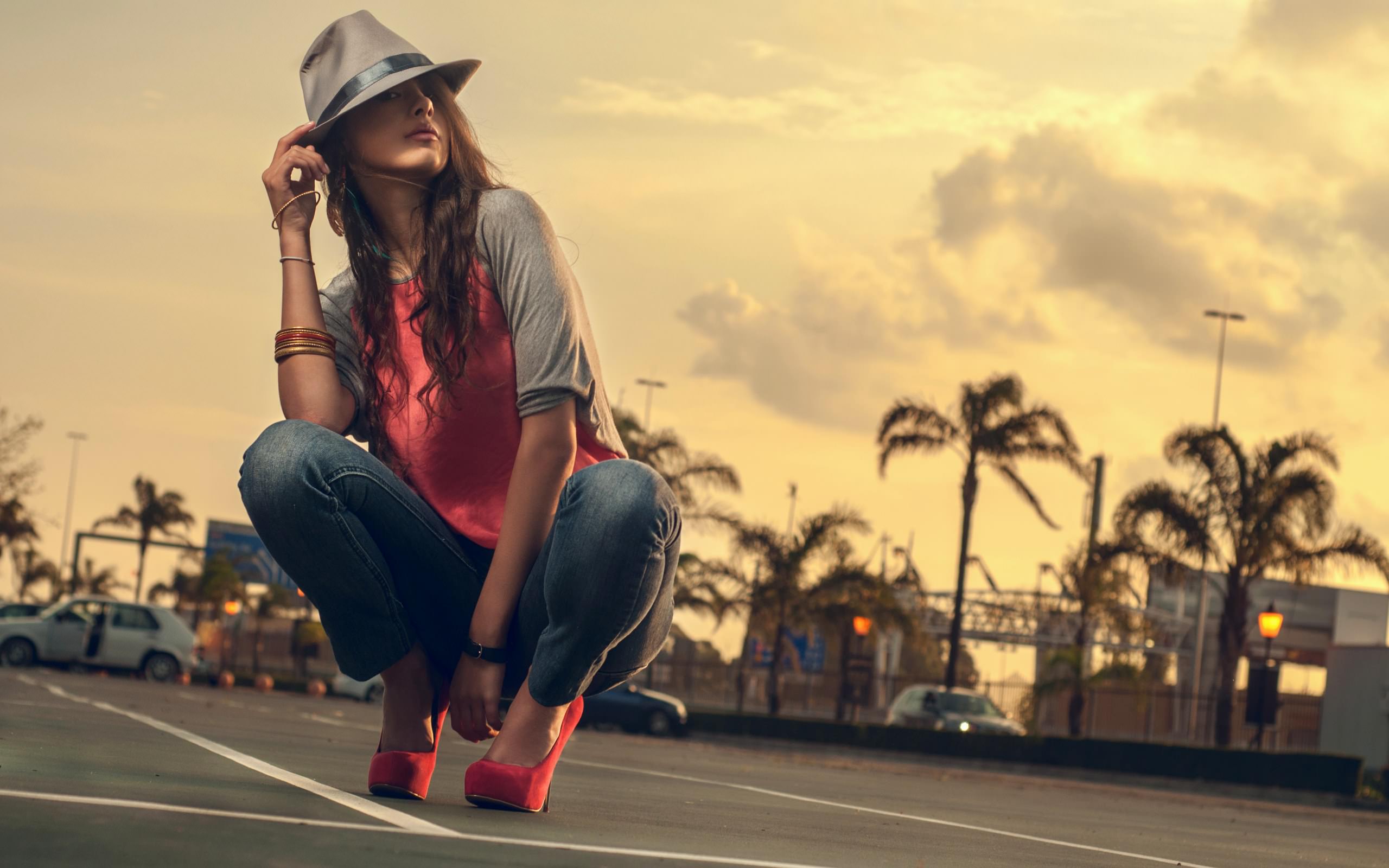 Девушка в шляпе, на красных каблуках, в джинсах присела на асфальте, брюнетка в шляпке.