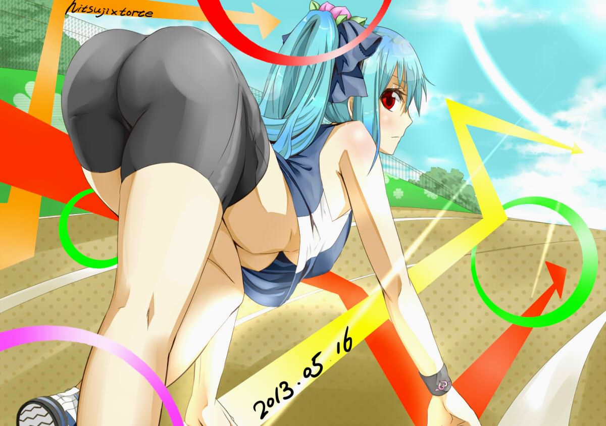 Девушка приготовилась бежать, приподняв свою упругую попку в обтягивающих шортиках, на старте, бегунья, легкоатлетка с классной попой на беговой дорожке.