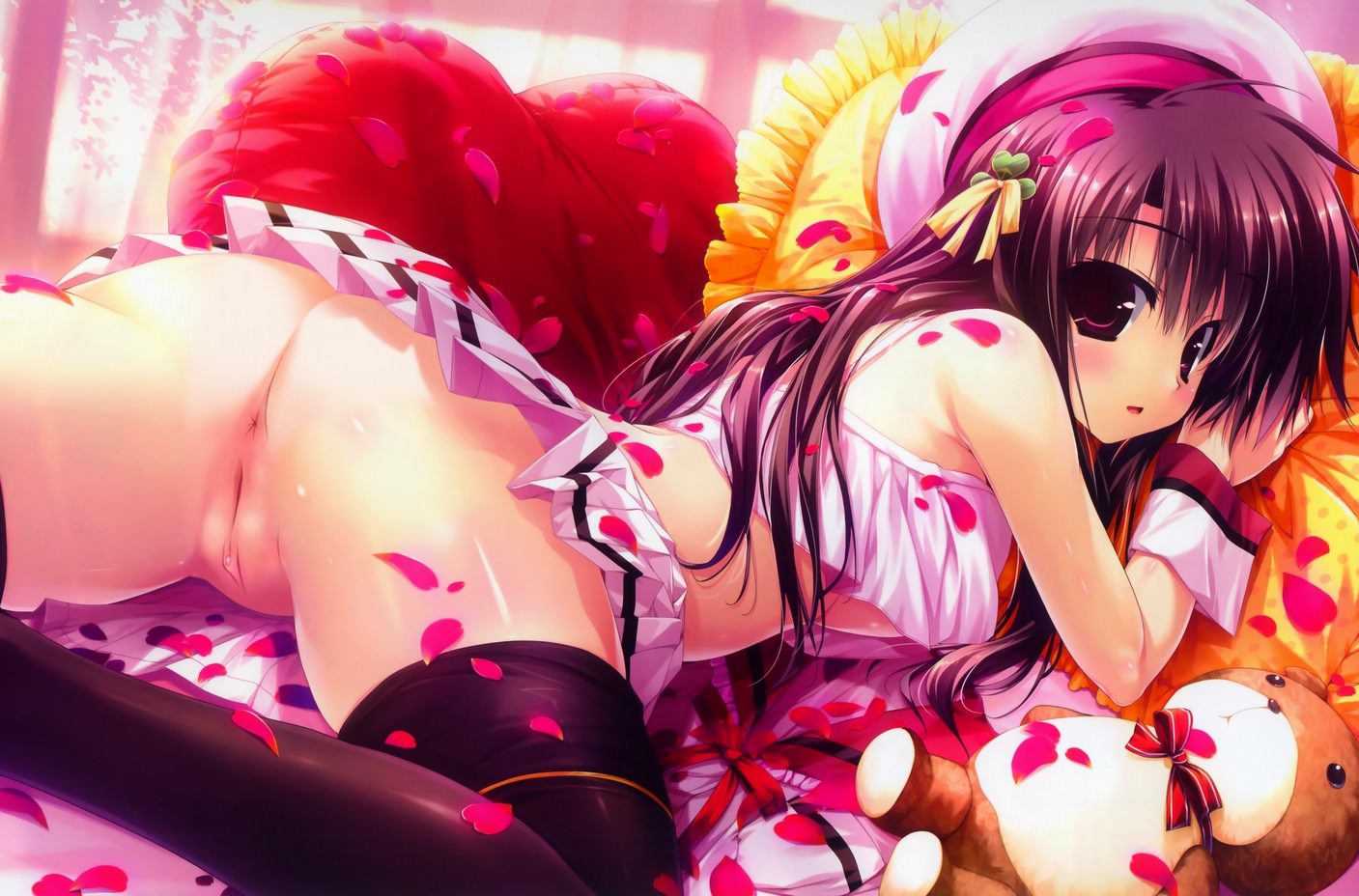 Красивая девушка без трусиков лежит в своей постели, в черных чулках,пурпурные волосы и розовая одежка, очень короткая розовая юбочка а под ней нет трусиков, сладкая бритая щелка и молоденькая попка.