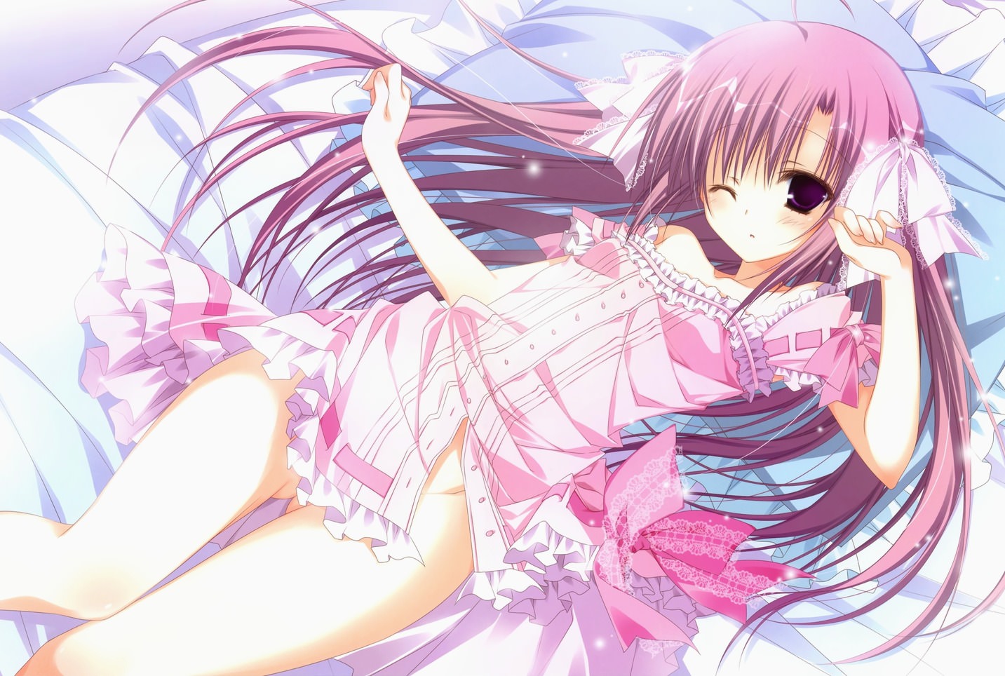 Девушка в розовом платье без трусиков, длинные розовые волосы, подмигнула глазом, лежа на кровати.