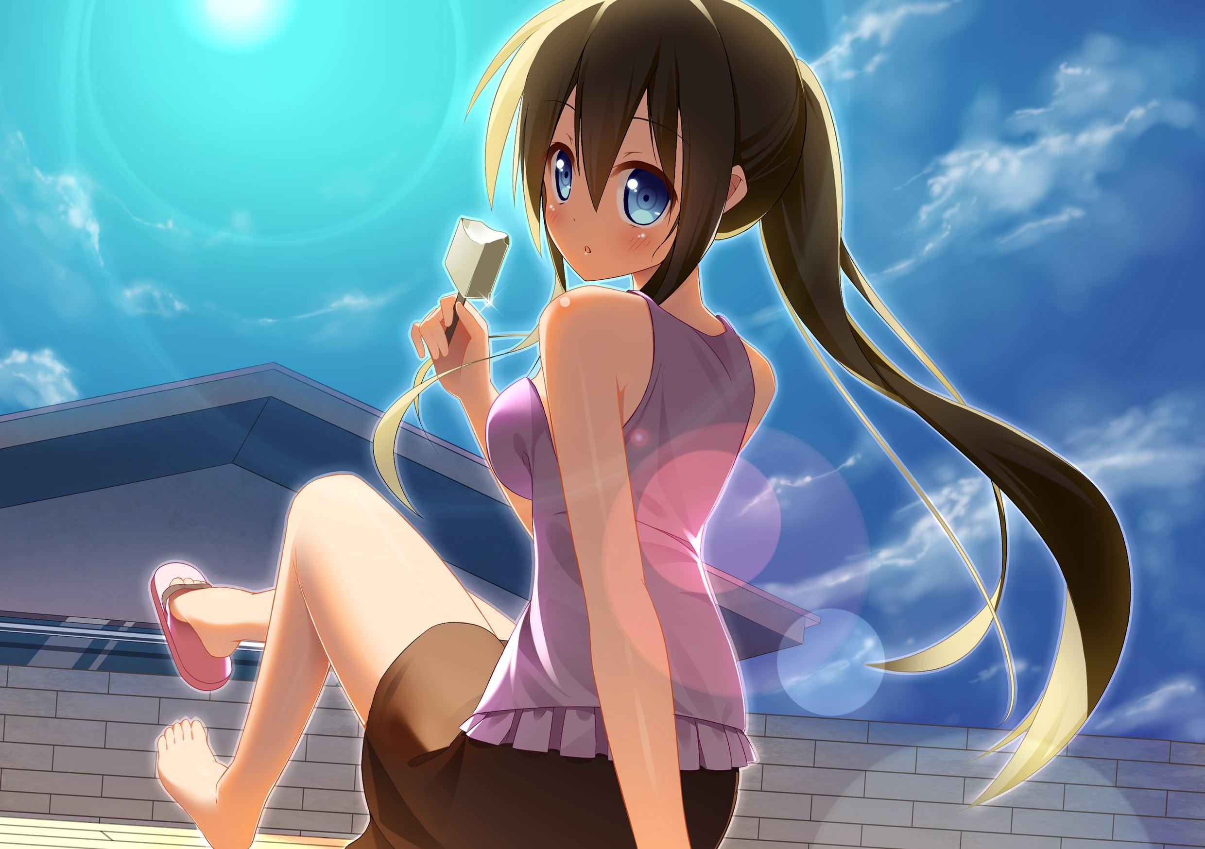 Красивая милая девушка лакомится мороженным на палящем солнце жарким летним деньком.
