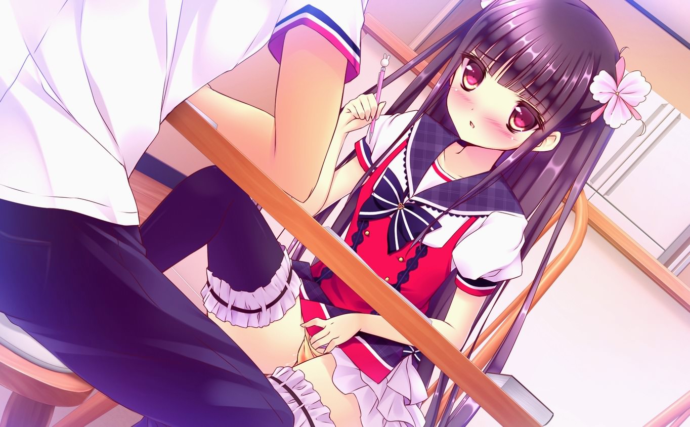 Школьница сидит с парнем за одной партой, и глядя на него ласкает себя между ног. Школьница засунула пальчики в трусики под столом, глядя на парня и смущаясь.
