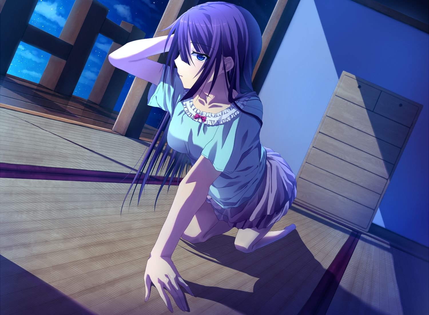 Симпатичная девушка эротично ползет на четвереньках по полу ночью.