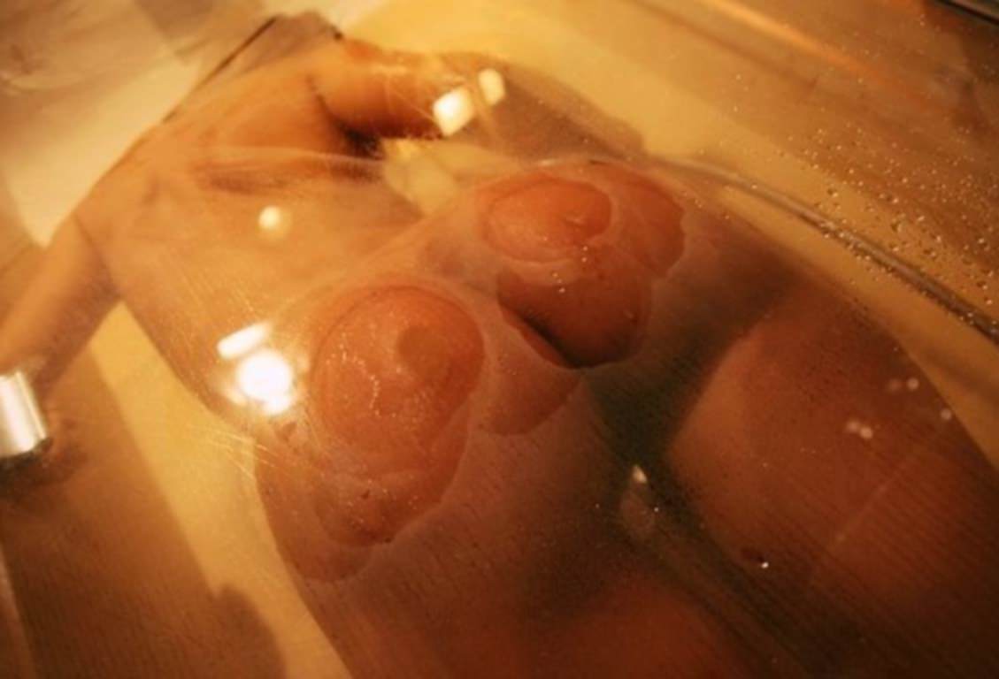 Девушка с четкой попкой в душе, прислонилась попкой к стеклу душа, Girl with a clear ass in the shower.