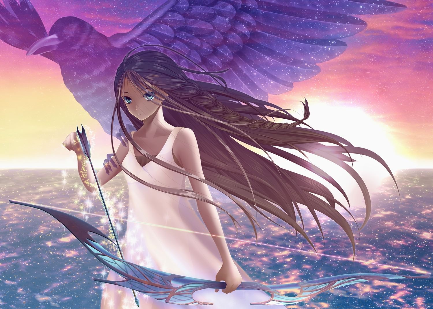Прекрасная девушка с пернатым спутником и боевым волшебным луком в руках, на рассвете у моря, очаровательная девушка в белом платье с луком и стрелами.