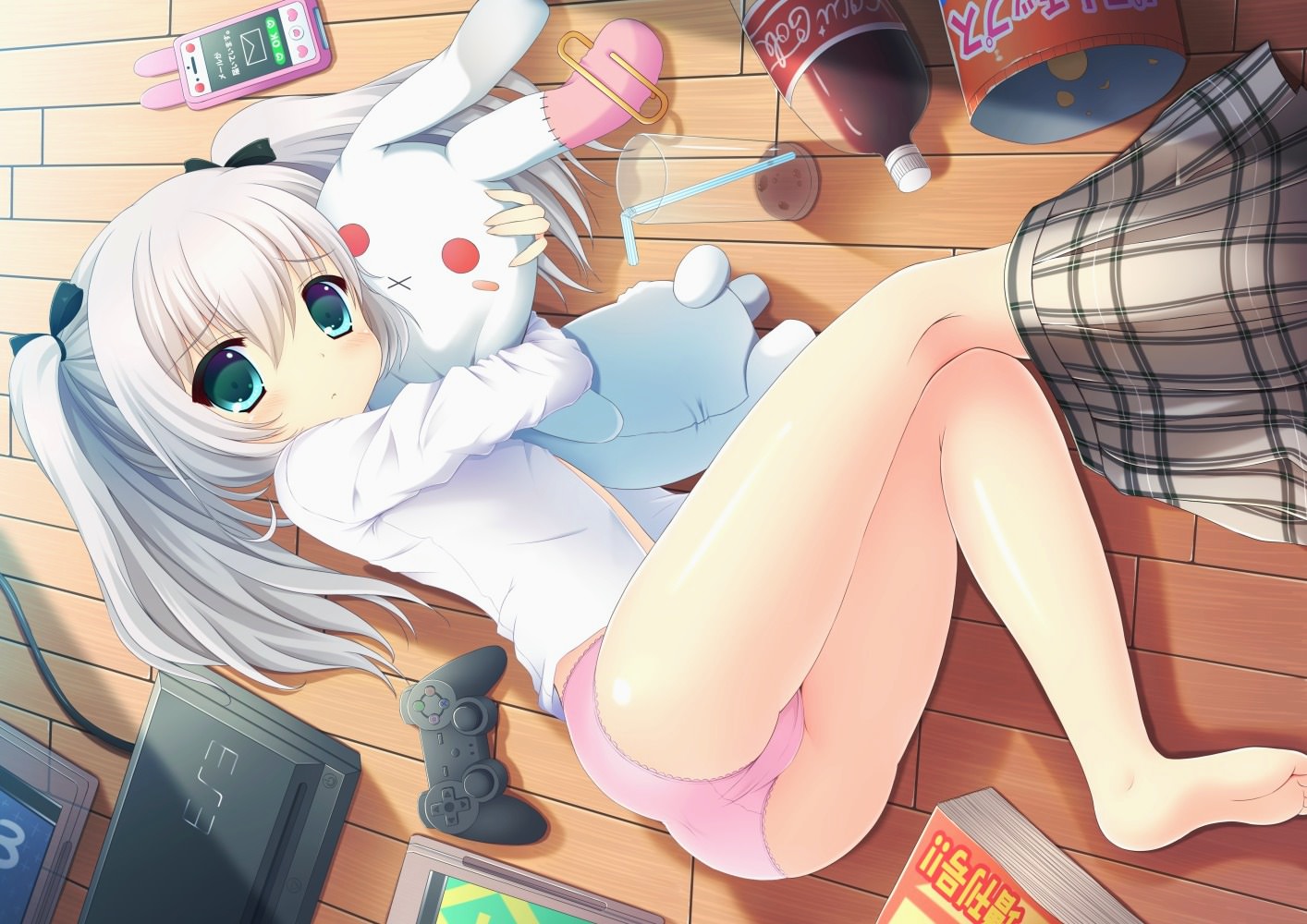 Милая девочка в розовых трусиках и рубашечке обнимает плюшевого зайку, лежа на полу, приставка PS3 на полу, мобильник и кола.Милая, девочка, в, розовых, трусиках, и, рубашечке, обнимает, плюшевого, зайку, лежа, на, полу, приставка, PS3, на, полу, мобильник, и, кола |