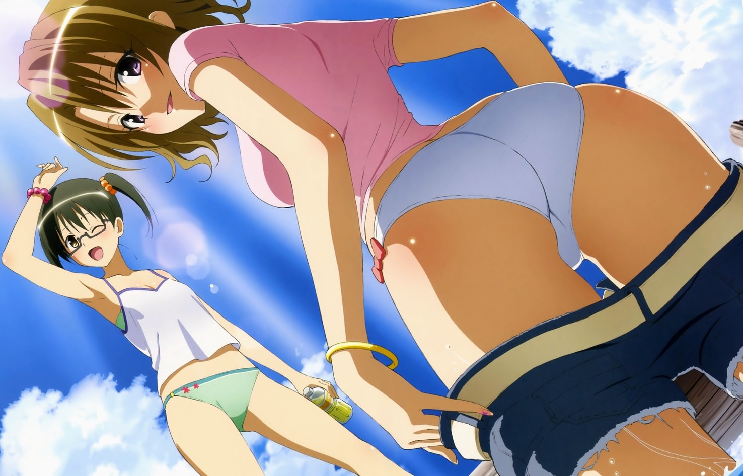 Девочки пришли отдохнуть на пруд, снимают шортики, девушка снимает свои шортики, обтягивающие белые трусики на попе.
