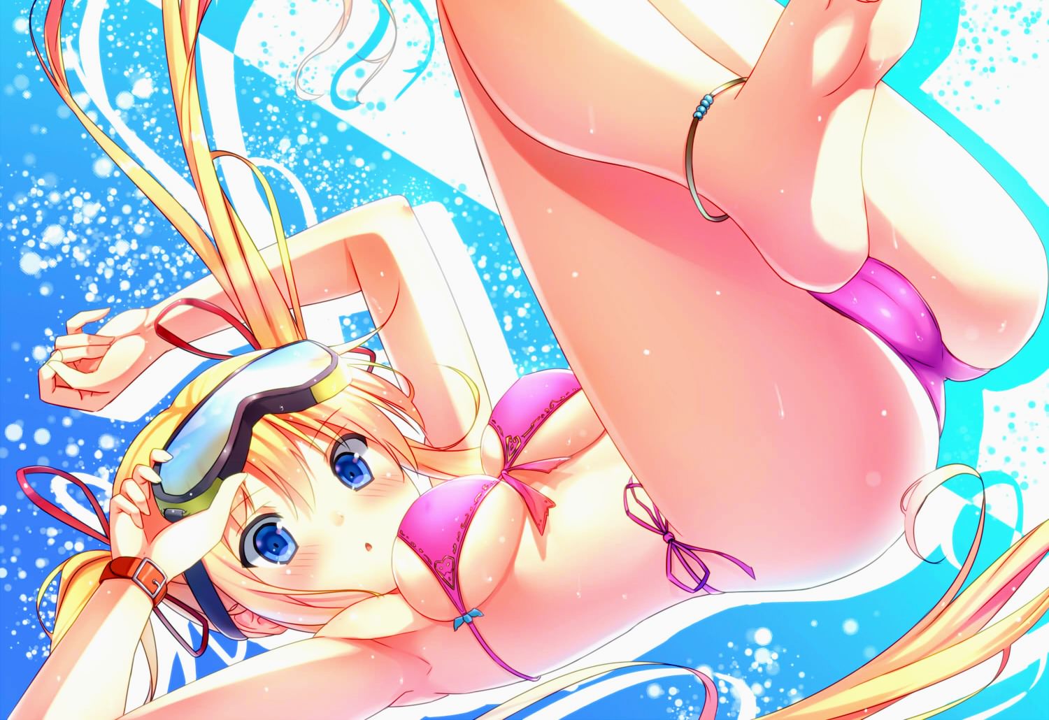 Девушка в эротичном розовом бикини на воде, снимает плавательные очки, классные сиськи.