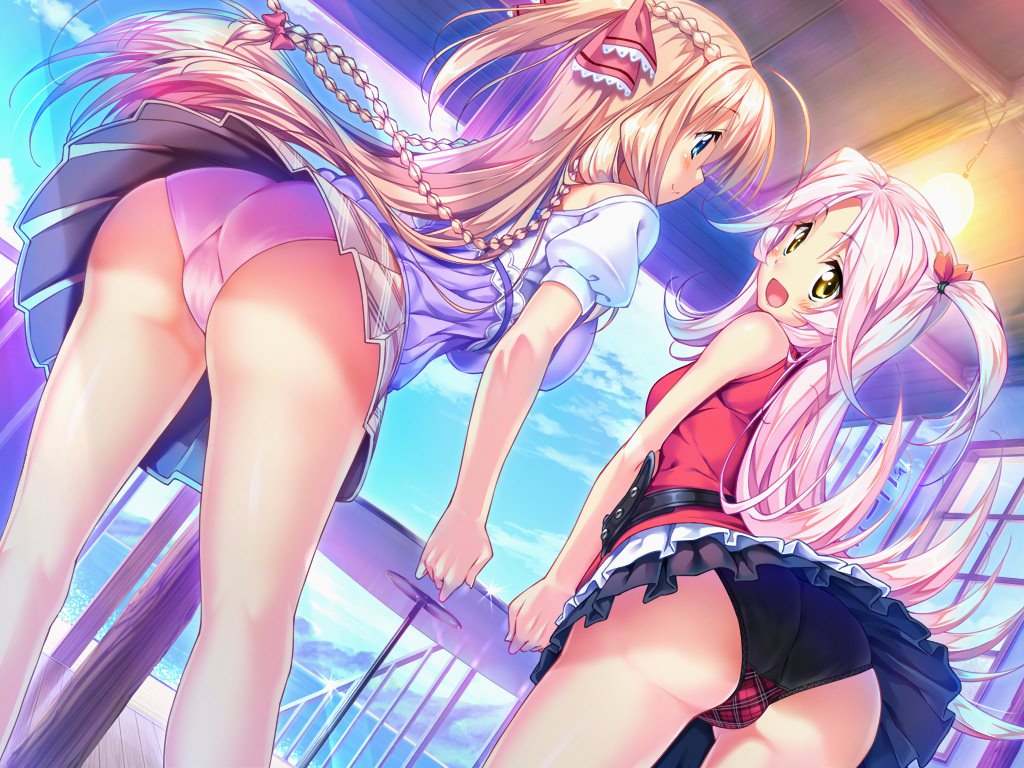 Очаровательные девушки с фантастическими попками под мини юбками в летнем домике с бассейном, розовые трусики под юбочкой, черные трусики под юбочкой, сексуальные подружки.