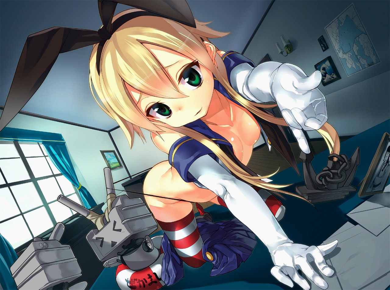 Светловолосая девушка без нижнего белья на четвереньках в комнате, красно-белые полосатые чулки, белые перчатки.