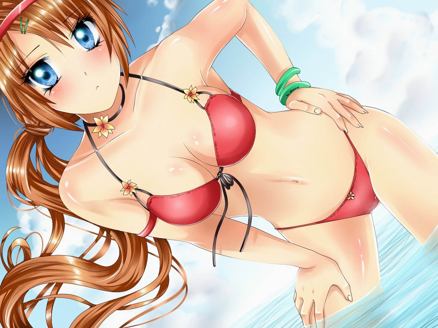 Голубоглазая красотка в красном бикини на море, красивая грудь и фигура в целом.