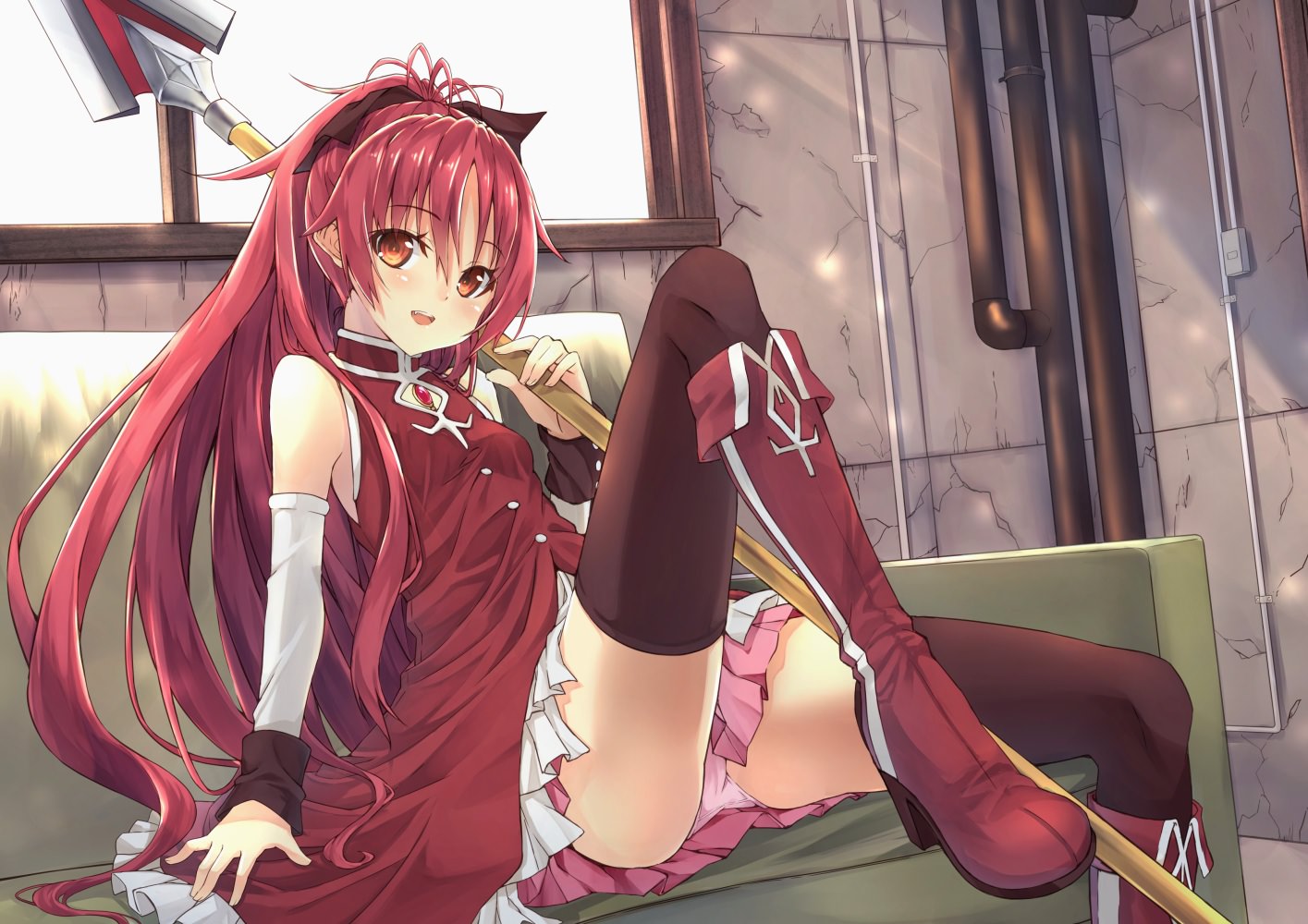 Обаятельная девушка в красном платье и с острым длинным копьем в руке.