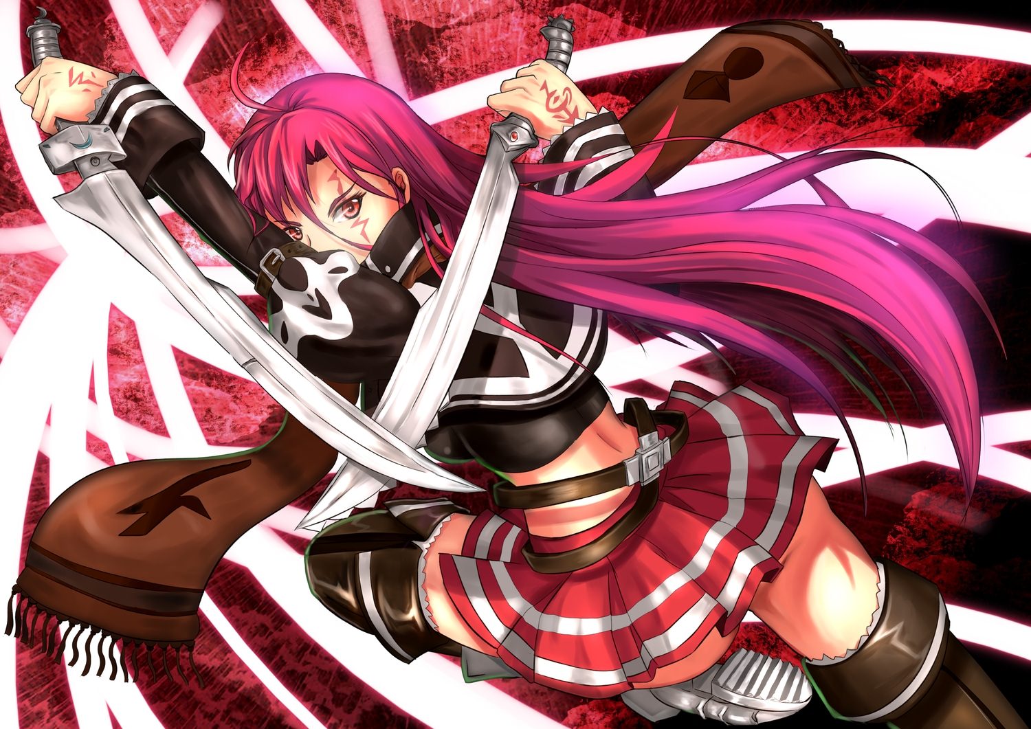 Девушка в двумя клинками, короткая красная юбка и розовые волосы, шарф.