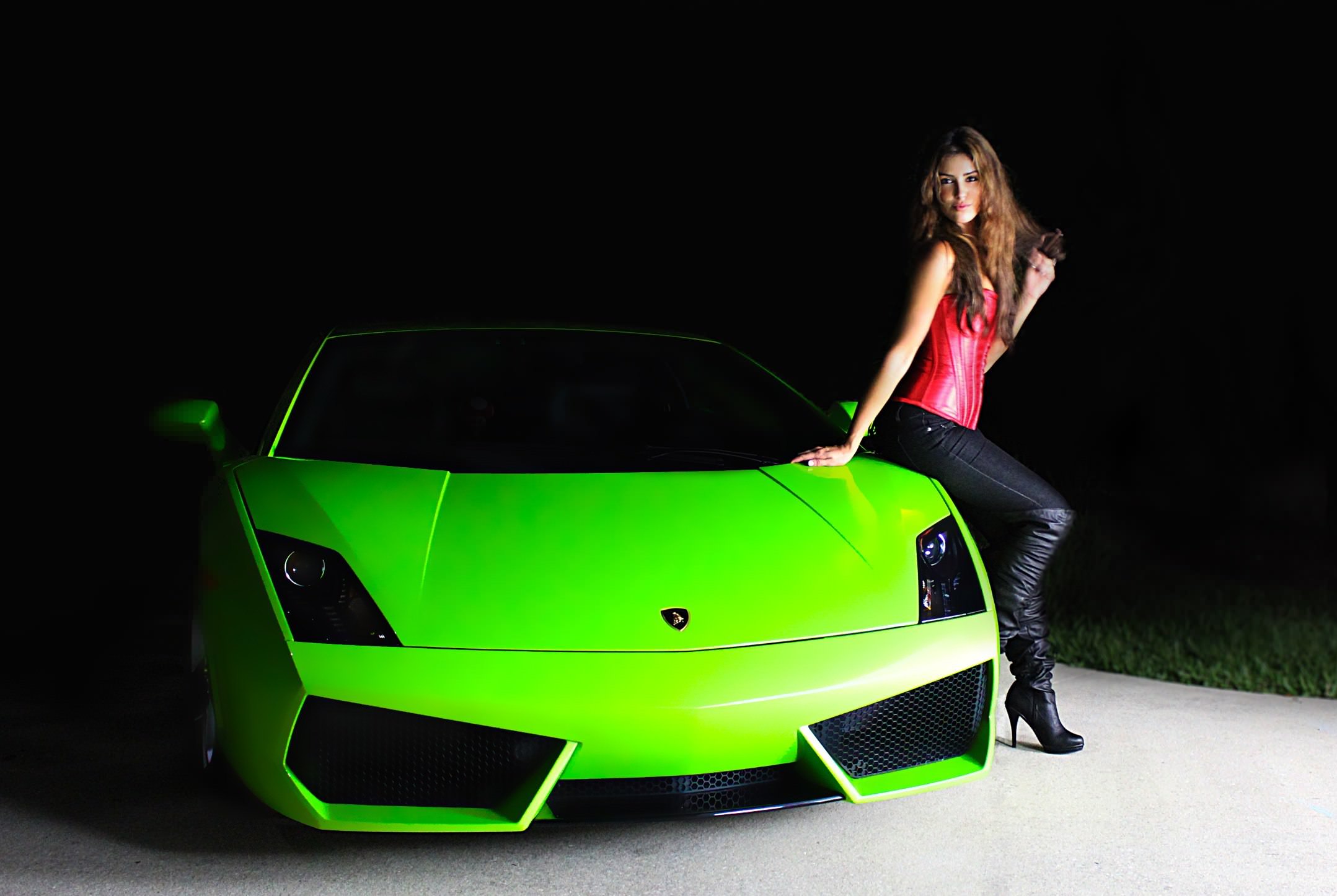 Девушка в красном корсете и черных штанах возле зеленого Ламборджини в темноте на дороге.