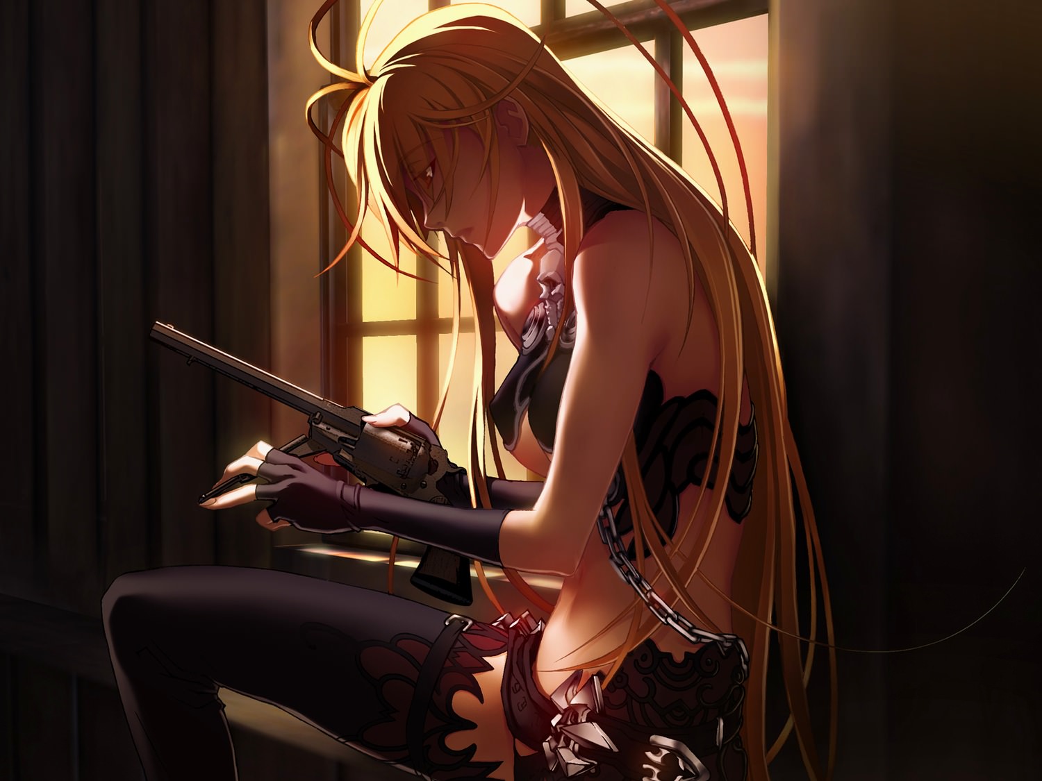 Длинноволосая блондинка перезаряжает пистолет в темной комнате у окна, чулки, цепь, револьвер.