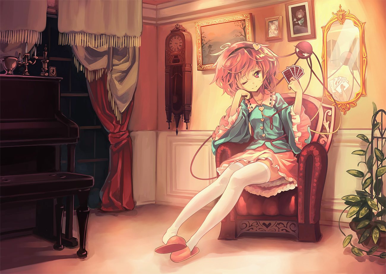 Подмигивающая девушка в кресле с картами на руках, девушка в белых чулках и юбке сидит одна в комнате.
