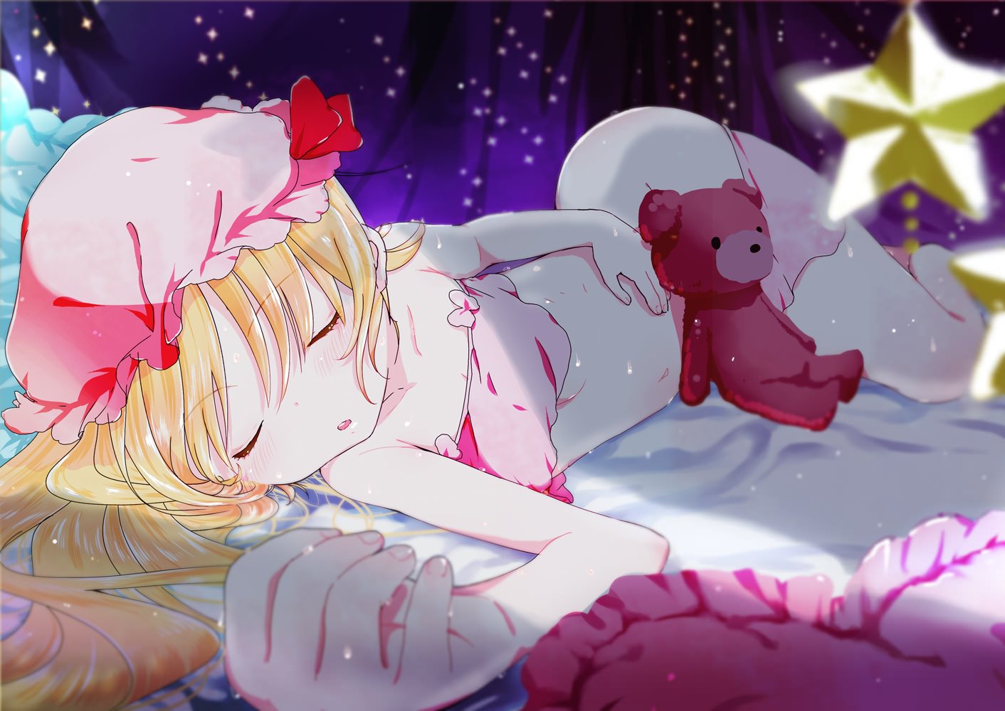 Светловолосая милая девчонка сладко спит в своей постели с плюшевым мишкой в розовой ночнушке.