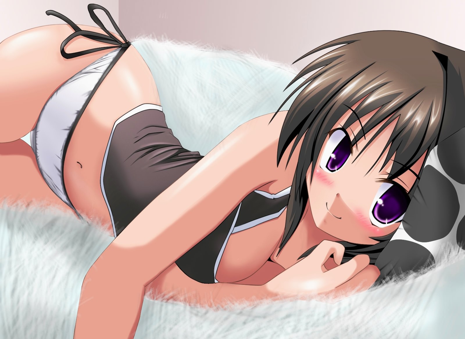 Милая девушка в мягкой постели в трусиках и майке слегка засмущалась, красивая девушка с сексуальным стройным телом лежит на кровати и мило улыбается.