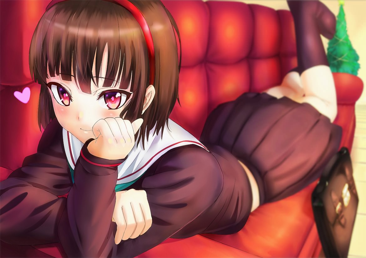 Влюбленная школьница на диване, школьница влюбилась, красный диван, любовь школьницы.