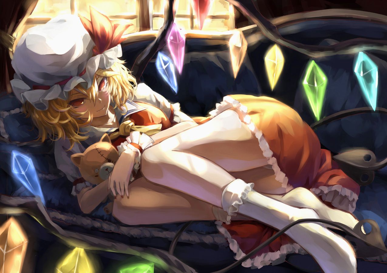 Загадочная девушка в плюшевым мишкой на диване, дьявольский длинный хвост, белая шапочка, желтое платье, белые носочки и разноцветные кристаллы вокруг.
