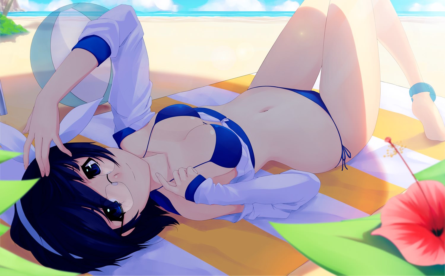 Девушка в синем бикини отдыхает на пляже, расстелив полотенце, в очках, стройные красивые ножки.