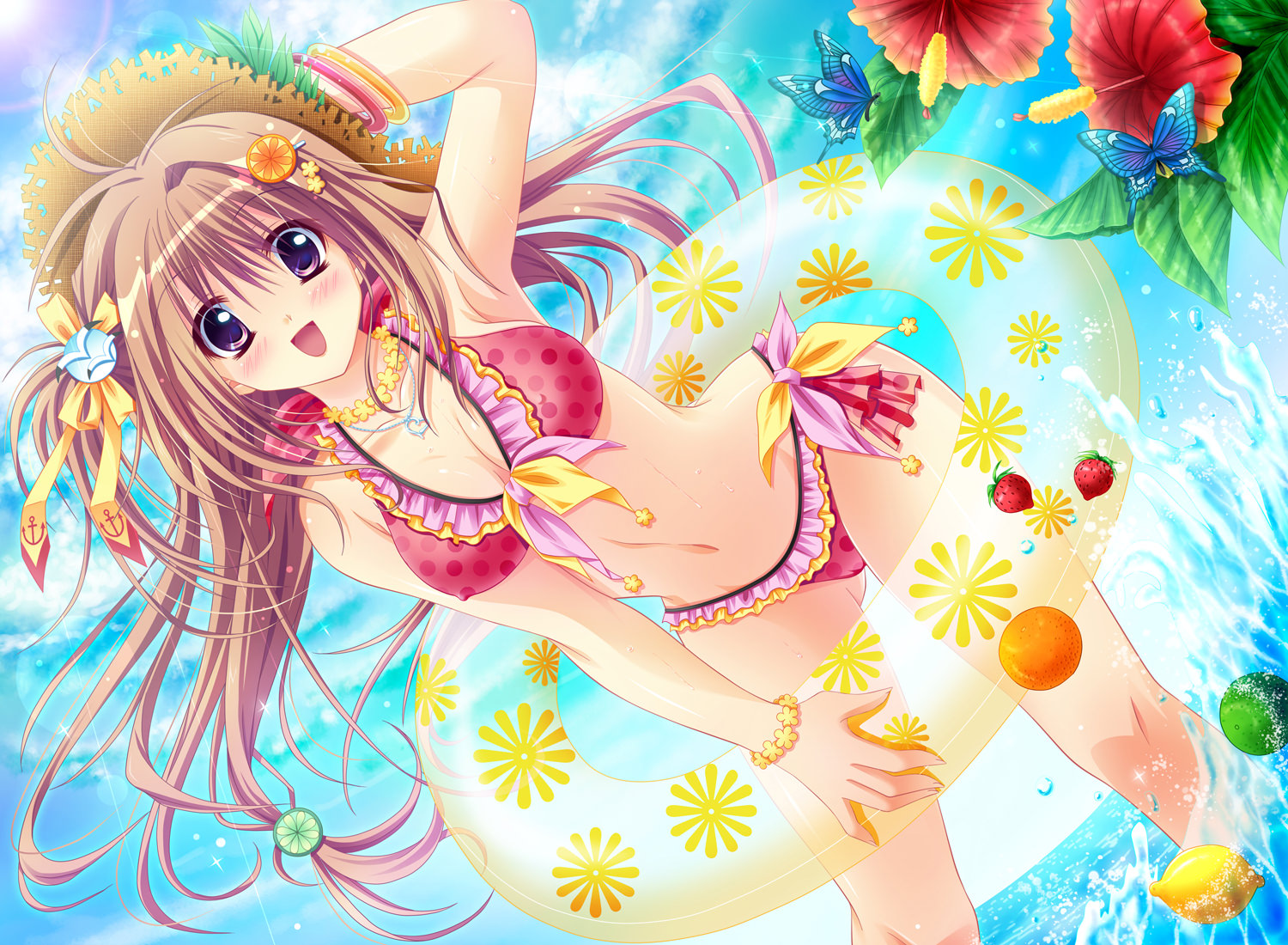 Веселая девушка в красном бикини в воде, придерживает шляпку, надувной круг на талии, цветы, бабочки, скоро лето.