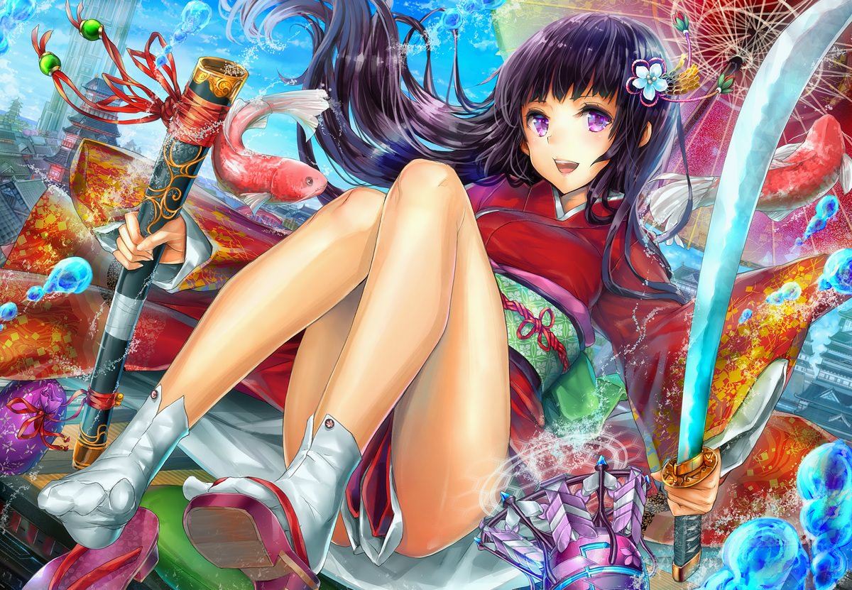 Веселая девушка в красном платье и саблей в руке, красивые ножки, яркие краски, девушка с мечом.
