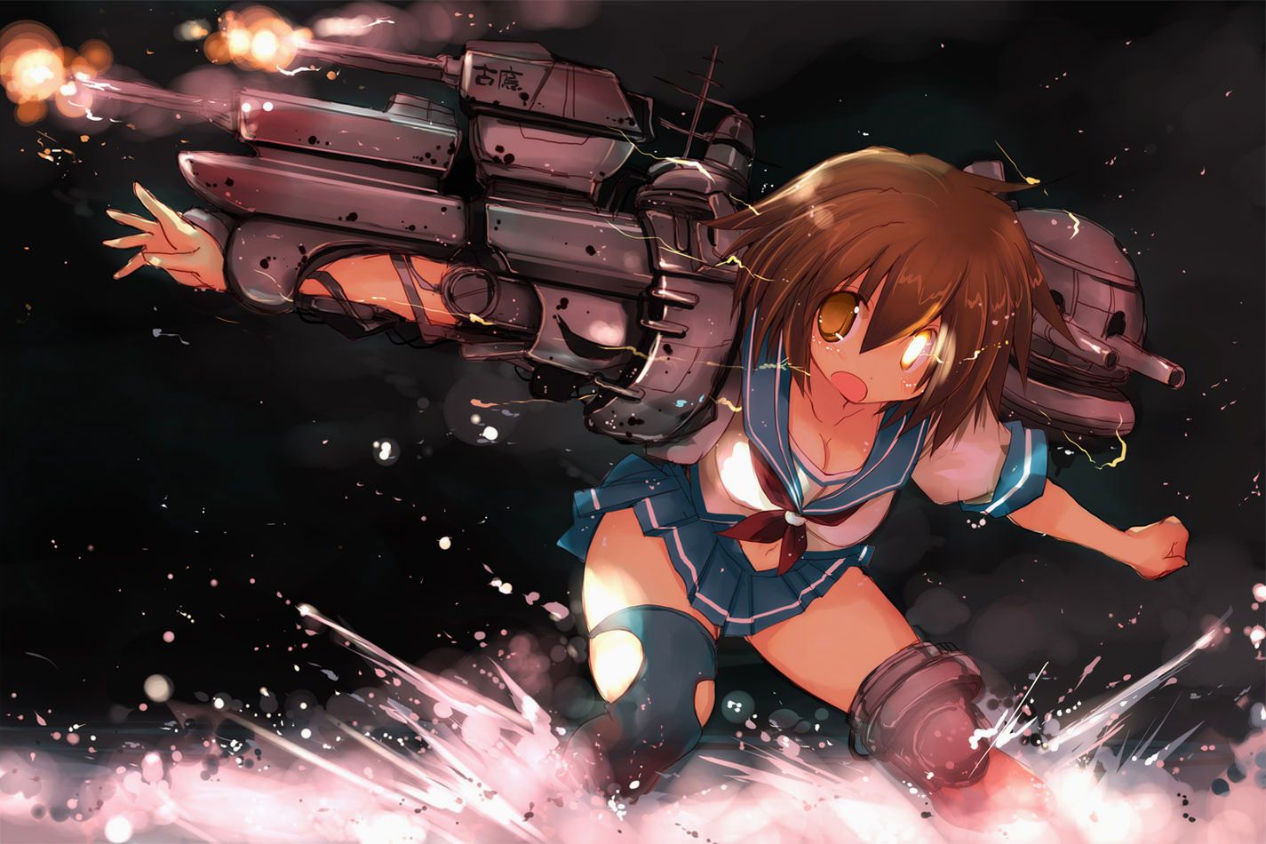 Девушка-киборг в голубой юбке и с огромным пулеметом на руке.