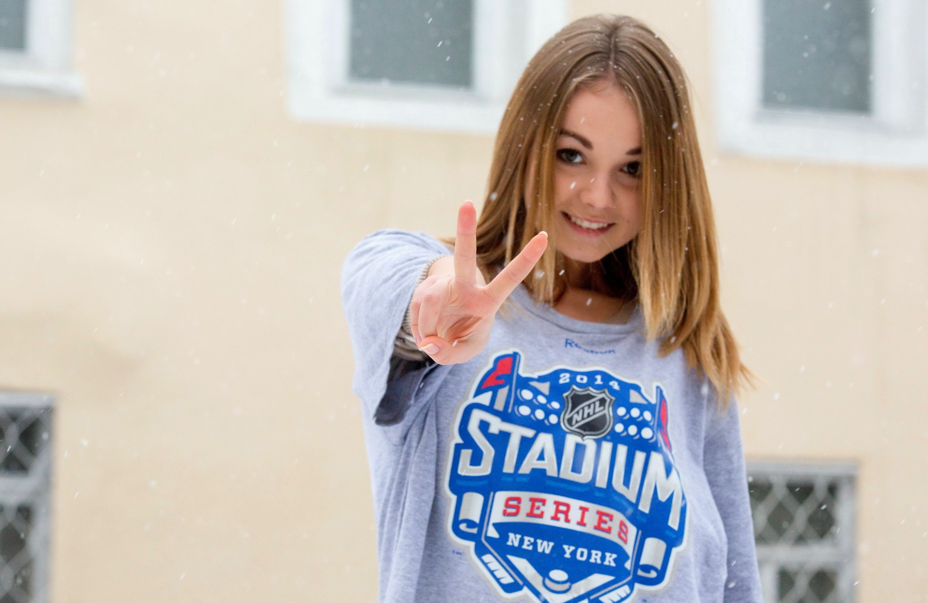 Красивая школьница в серой футболке показала два пальчика, легкая улыбка, небольшой снежок идет, justgirls (1065).