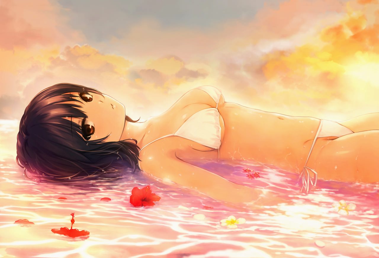 Красивая девушка в белом бикини лежит одиноко на пляже, розовые краски, оранжевое небо, ecchi (1323).