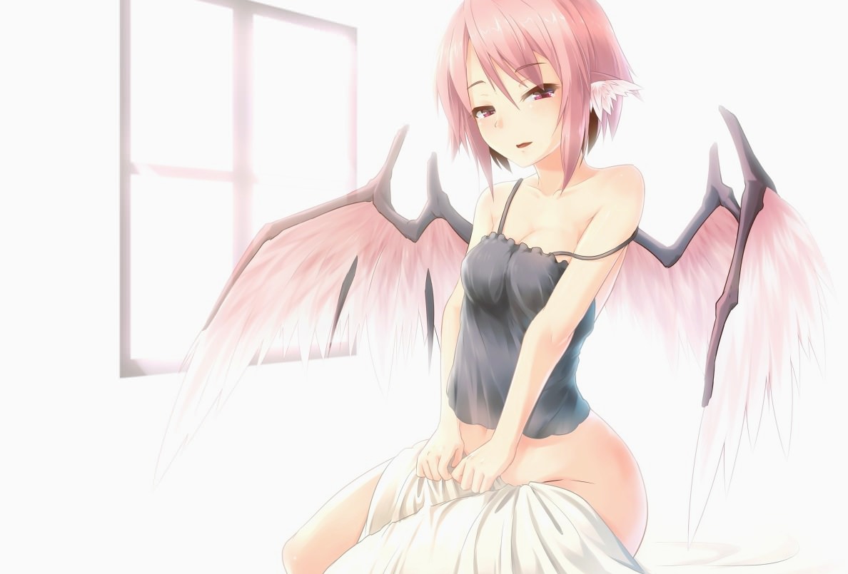 Смущенная, девушка, без, трусиков, на, кровати, прикрыла, прелести, одеялом, крылья, демонические, на, спине, черная, майка, розовые, волосы, angelsdemons, (180)