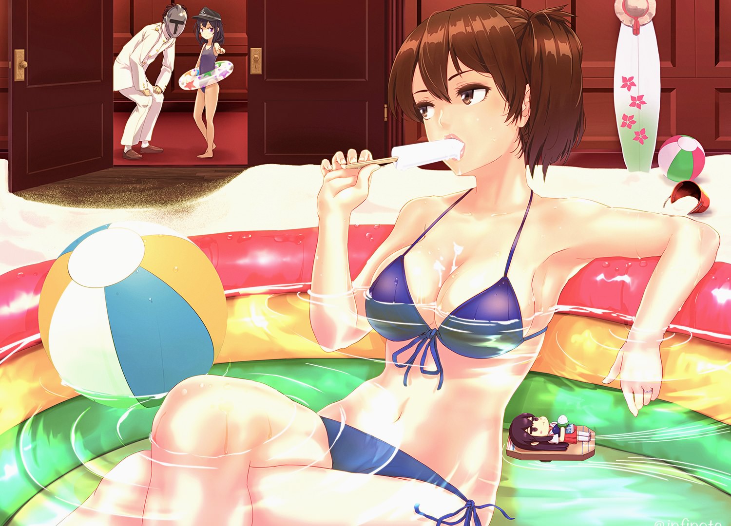 Соблазнительная девушка в бикини в надувном мини бассейне в комнате, эротично облизывает мороженное, классные сиськи, мячик, младшая сестра жалуется отцу, ecchi (1342).