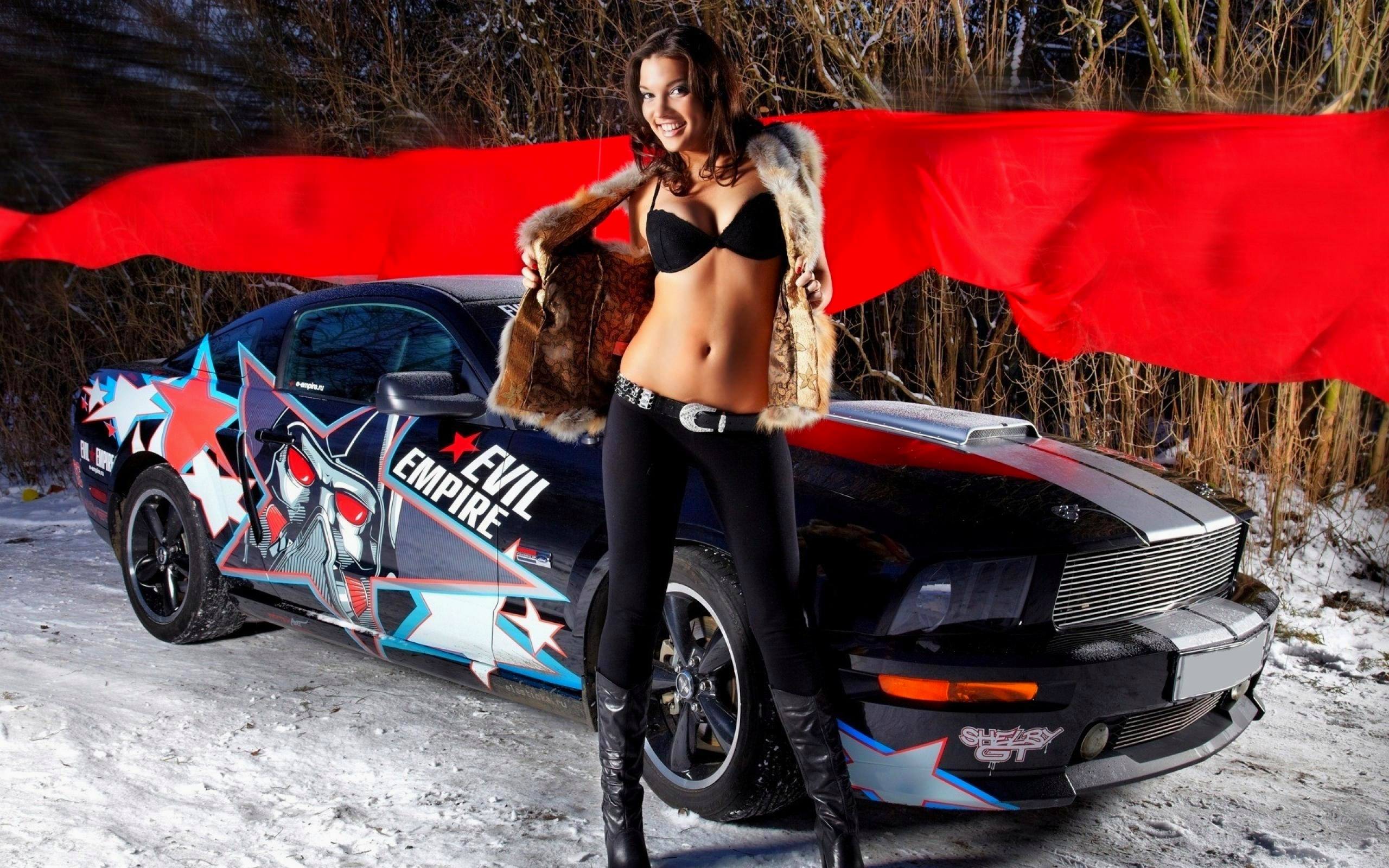 Сексуальная, брюнетка, в, черном, лифчике, и, черных, леггинсах, возле, разукрашенного, мускул, кара, красная, лента, черные, сапоги, мех, снег, Girls&Cars, (708)