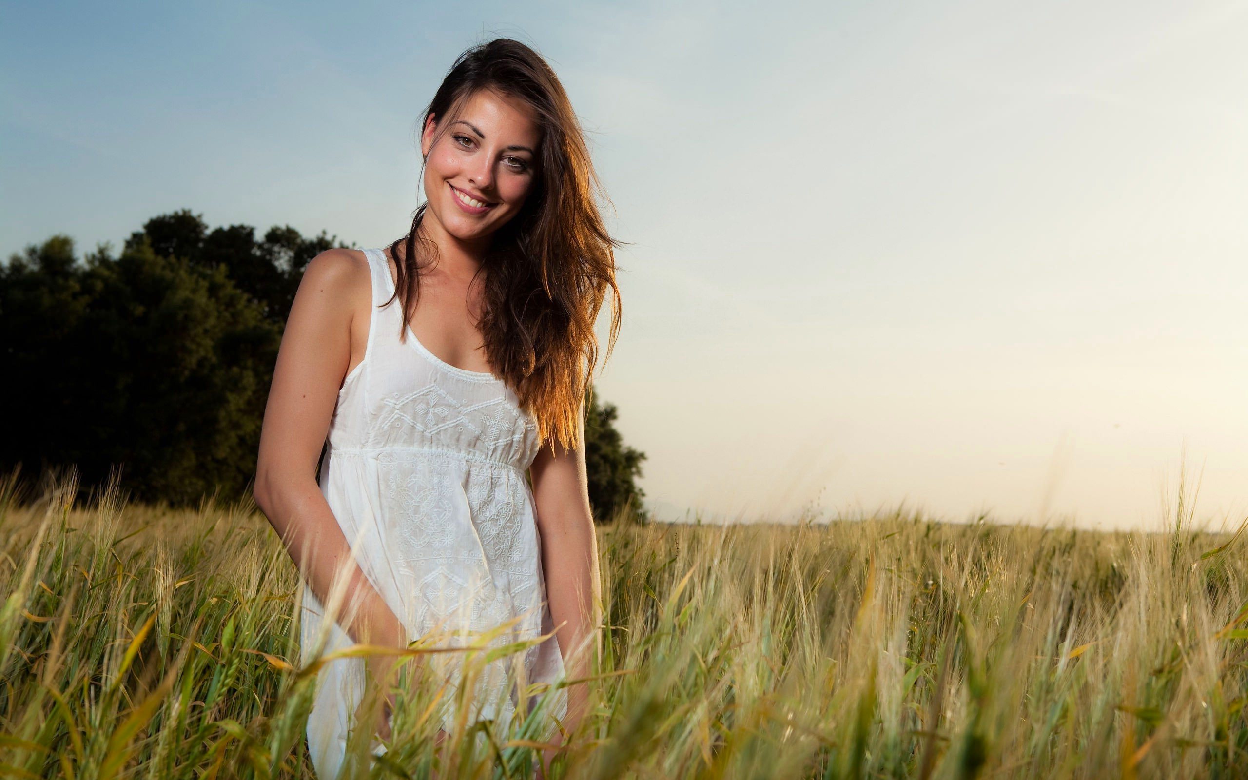 Красивая, милая, девушка, в, белом, летнем, свободном, платье, гуляет, по, полю, с, пшеницей, голубое, небо, красивая, девушка, в, траве, justgirls, (1113)