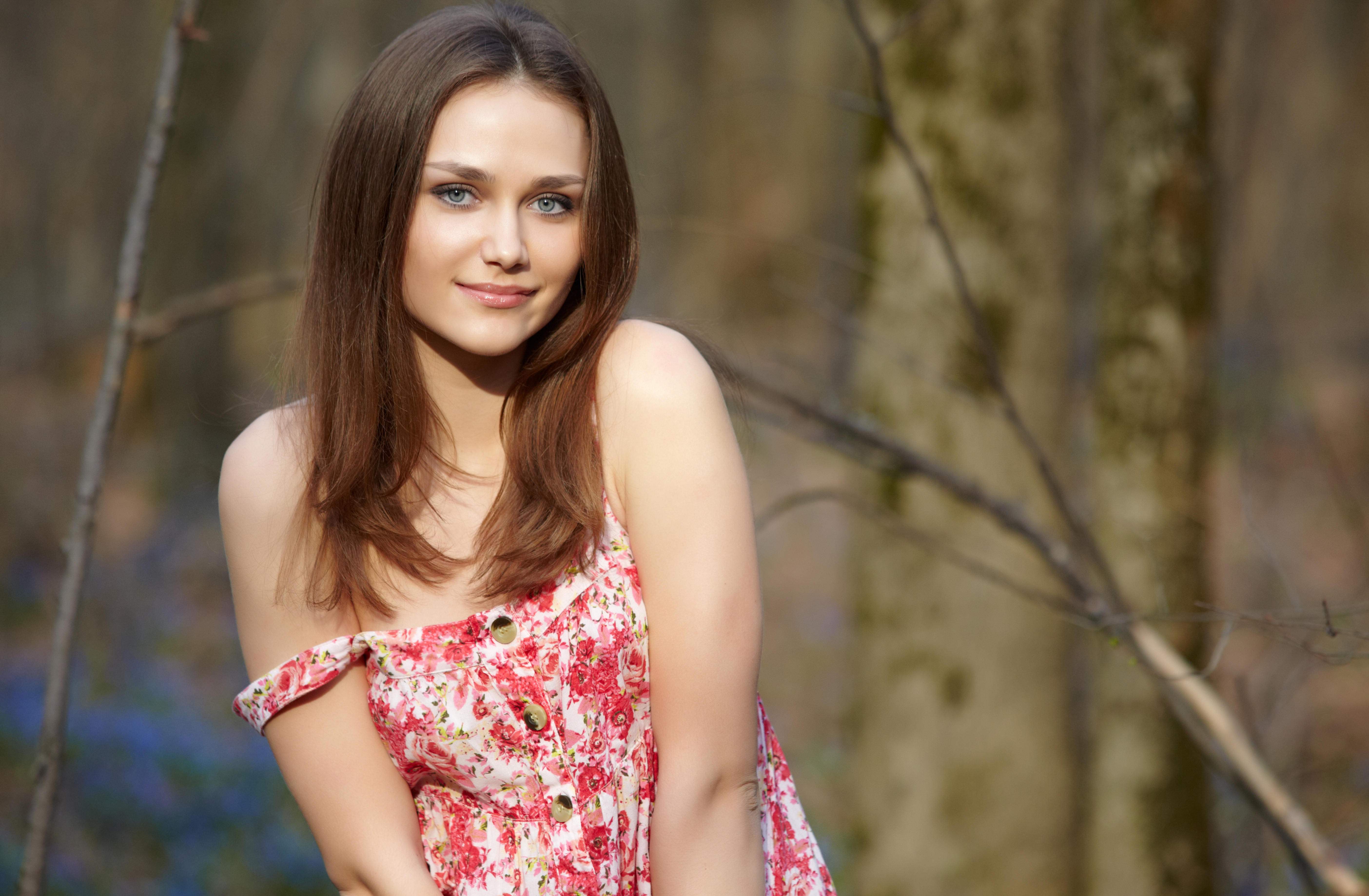 Милая девушка с легкой красивой улыбкой в красно-белом простом летнем платье в лесу, лямки слетели с плеч, красивая девушка на фоне деревьев, justgirls (1129).